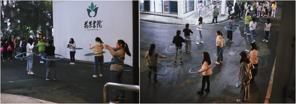 “花果八点半”一小时习惯养成计划的参与者们也融入其中,一同转起呼啦圈,沉浸体验夜市的浪潮。