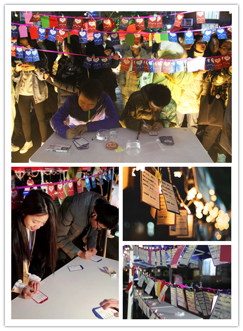 华灯初上,霓虹迎身。花果朋友圈作为书院夜市中的交友平台,以卡片的形式将意在寻找志同道合朋友们的信息展现出来。一个个摊位承载着移通学子交友的热情,一张张卡片上填写着有趣的交友宣言。一杯暖暖的姜茶,来自后勤老师们对大家的关爱。灯光下的名字,人群中的回眸,拨出的电话,取下卡片后的相视一笑。“他们相隔许久,又好像就在眼前”,交友宣言描绘了他们的期许,花果夜市计划了他们的相遇。