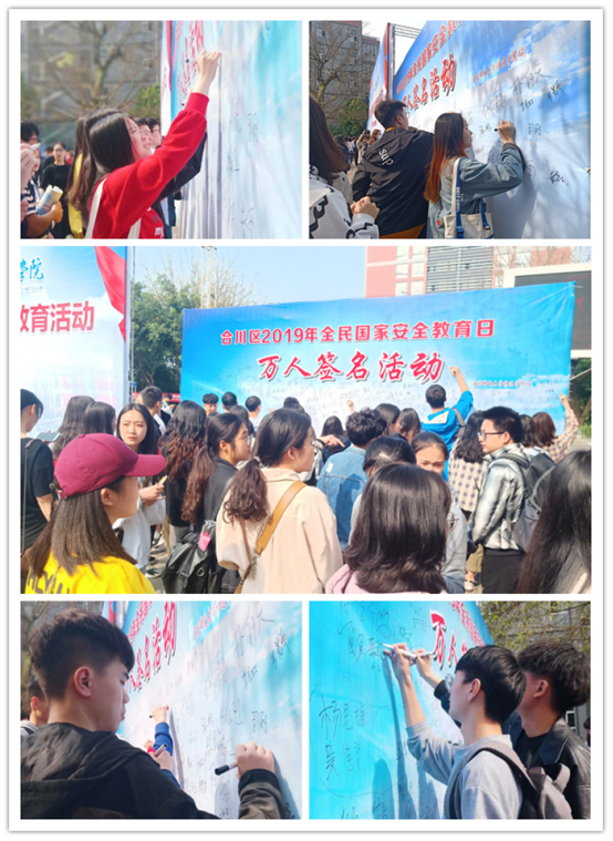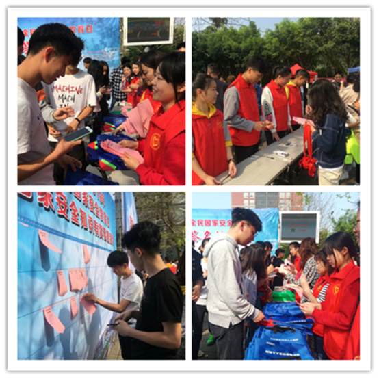 2019年4月17日上午,合川区“2019年国家安全教育日”宣传主题活动在我校黄桷树广场举行。该活动基于我校与合川区平安志愿者联合会以往的成功合作,借此机会再一次携手宣传国家安全知识,进一步让国家安全教育走进校园,让广大学子接受国家安全法制教育,自觉遵纪守法,学会用法律维护国家安全;培养全体师生国家安全观,提高全体师生国家安全意识,增强全体师生国家安全责任,做一名知法守法的合格公民。