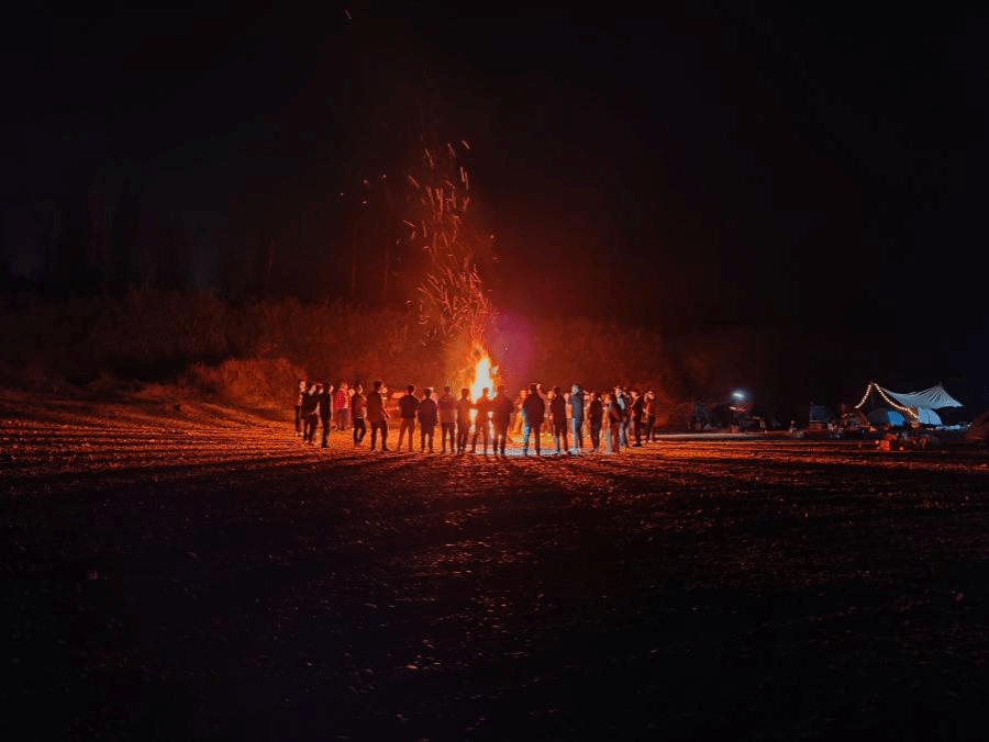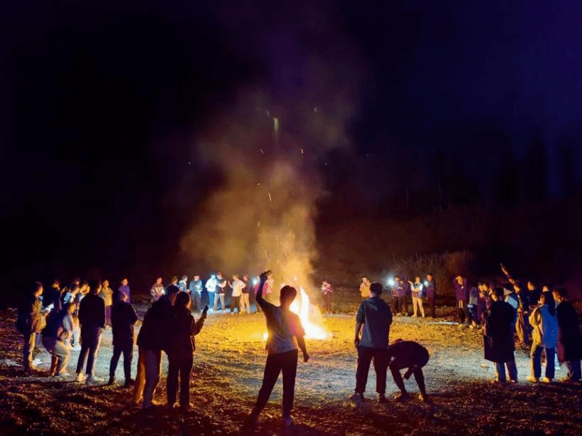 大家协同配合将寻来的柴火收集在一起点燃,亮眼的火苗从柴火上一窜而起,映照出每个成员充满笑意的脸庞,也拉开本次露营活动的序幕。大家手拉手,围成一个大圈,跟随着节奏大声歌唱,此刻没有五音俱全,没有音色俱佳,只有自由与热爱,只有心中那一丝对过去的遗憾和对未来的希望。