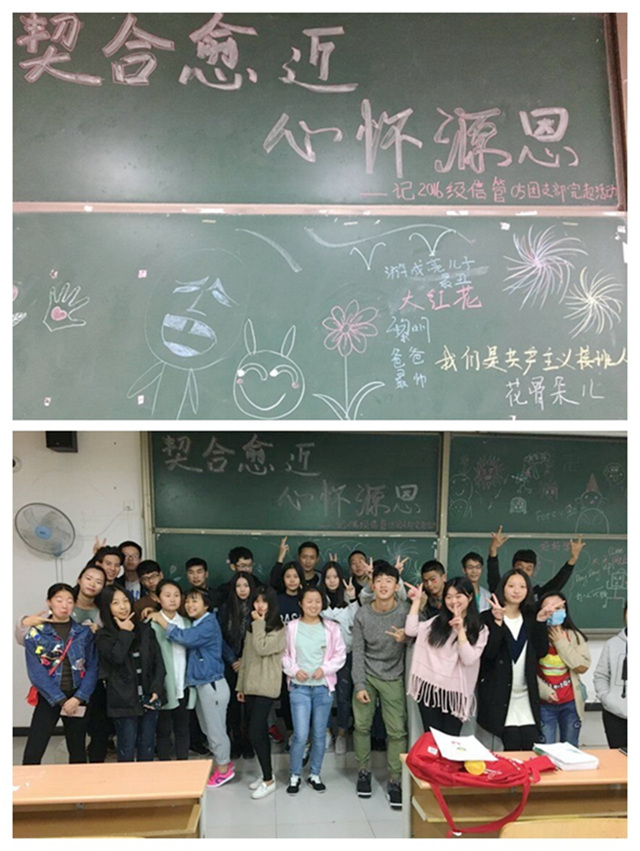 迷蒙纷繁之路,携手翘首以盼 “我此刻最想见到的人是我的妈妈,因为当我一个人坐在桌前在暖黄灯光照射下准备这些纸条的时候感到有些委屈也有一些想家。”这是我作为表率在活动开始时为大家分享自己的内心独白。活动当天发生了一件令人欣慰的一幕:由于事先安排的班委因紧急会议不能按照计划去布置教室,当我迈着焦急的步伐跑到活动现场时,发现大家都齐心协力一笔一划地写着板书,画上一些可爱而又无厘头的图案,也有同学在自觉提醒还未到场的伙伴按时参加活动,虽然后来的“活力暖场活动”环节也有出现一些规则理解上的小失误,可是每个人都能够相互理解、配合并融入这个集体中去。但是看着大家能够坐在一起分享欢乐与感怀,携手共进,我便满怀希冀与盼望。