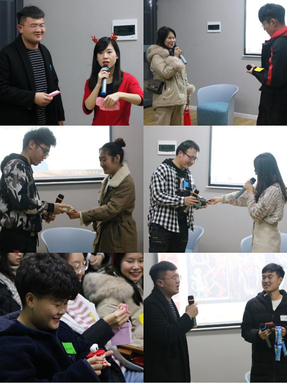 之后,为了更好的让来自不同学院不同年级的同学们了解彼此、增进感情,并且提高口语表达能力,活动专门设置了一个互赠礼物的环节。最开始准备的纸条也有了用处,每个人从袋子里抽出一张纸条,找出互赠礼物的对象。通过电脑自动筛选决定顺序,赠礼的双方需要用英语互相为对方送上祝福。看得出大家都是有用心准备的,送的礼物花样百出,有毛绒玩具,啪啪圈,玩具牙齿,据说是让对方装送给男朋友或者女朋友的礼品盒……最有趣的是一组男生,其中一个生准备了一串棒棒糖,按照抖音爆款藏棒棒糖的方式藏在袖子里让对方抽,看样子是想邂逅一个可爱的女孩子。然而,对面交换礼物的是个男生,场面十分有趣,同学们都乐的前仰后合。