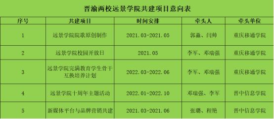 为探索集团远景教育新模式,促进远景学院在育人过程中形成合力,搭建学生培养新路径,重庆移通学院远景学院与晋中信息学院远景学院学工团队于3月23日在线上进行了深入沟通与交流,对各自学院今年的重点工作以及难点进行了分析,更好促进了两校今后的项目共建工作,就远景学院院歌原创制作、校园开放日互访交流、远景学院完满教育学生骨干互换培养计划等重点项目进行了讨论,同时也探讨了共同培育具有远景特色的精英人才相关问题。此次参会的有两院学工副院长、全体辅导员、书院导师、宣传指导老师。