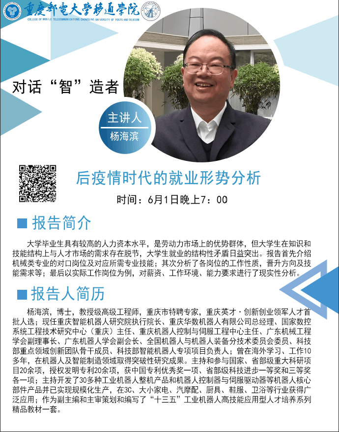为推进大学生知识技能结构与企业人才需求接轨,帮助学生树立正确的就业观,合理规划职业生涯,促进校企合作与对话,智能工程学院结合专业集中式书院的特色,开展对话“智”造者系列活动。6月1日晚7点,智能工程学院对话“智”造者第七期邀请到重庆华数机器人有限公司杨海滨总经理,以“后疫情时代的就业形势分析”为主题,在腾讯课堂给同学们开展着一场别开生面的讲座。智能工程学院学工副院长李巧,辅导员李凤及学生代表共计110余人聆听此次讲座,讲座内容深入浅出,现场气氛热烈,互动良好。