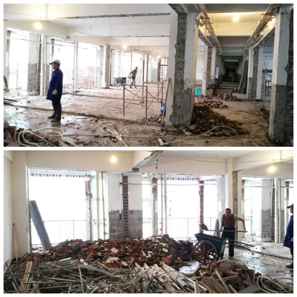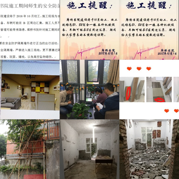 汇江书院在施工前向广大汇江学子发出了施工期间的注意事项及温馨提示,并在汇江书院的学生群里安抚同学,耐心解答因施工带来的各项问题,力求最大化降低对施工对学生们产生的影响。截止到10月17日,汇江书院功能室室内改造项目已完成墙体拆除。墙体的拆除,标志着重庆邮电大学移通学院汇江书院室内功能室改造工程拉开序幕。
