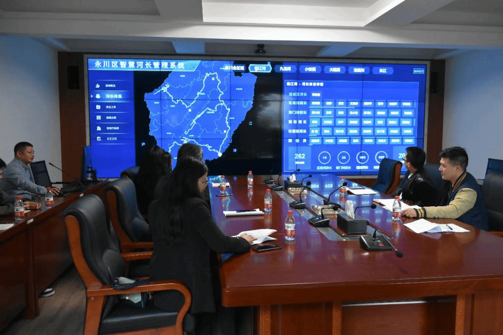 永川区水利局水利科王水明科长、水务管理处王春梅主任、水生态与河长制工作科科员潘永均同志以及神女湖物业管理公司唐挺副总经理出席本次座谈会。会议期间,潘显兵教授就神女湖从水库转型为景区的变化提出“在转型过程中,神女湖的功能有没有发生改变?”对此,王水明科长表示,神女湖此前作为水库时,有着农业灌溉、防洪等作用,现作为景观,唯一保留的只有防洪功能,神女湖的水源皆为天然水,且湖水较深,湖泊面积大,水量充足,在特殊时期,对下游河道水量补给也起着一定作用。彭薇薇老师提到“科技发展迅速,永川区是否也有运用大数据手段对水质监测等方面提供帮助?”水利局代表潘永均同志向调研团表示,河湖管理保护是一项复杂的系统工程,涉及上下游、左右岸、不同行政区域和行业。基于此,永川区积极推进河长制,在水质监测方面设立智慧河长管理系统,并现场向大家展示并讲解了该系统的运行模式。智慧河长系统将电脑端与手机APP相连接,便于永川区各河段河长向水利局进行日常监察工作反馈,且各河段污染源污染率等水质数据都会于系统终端显示,极大地提高了永川区流域管理体系工作效率。