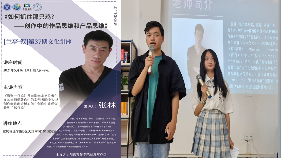 夏日葳蕤,天渠有约。兰亭再叙,文学盛宴。2021年5月16日星期天晚,重庆移通学院创意写作学院创意写作团主办“兰亭·叙”第37期文化系列讲座《如何抓住那只“鸡”——创作中的作品思维与产品思维》在天渠书院开启。