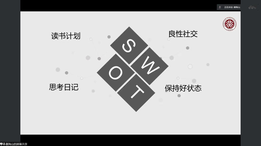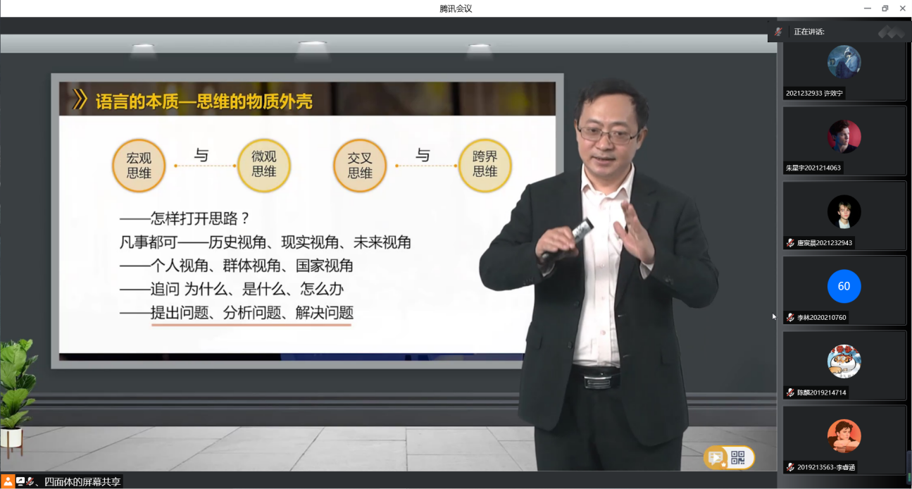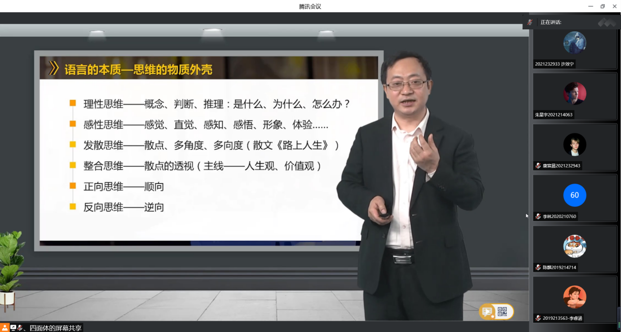 为提升同学们的社交能力,提高语言文字共情能力,2022年5月25日15点,花果书院名誉院长谢海山院长以“人际交往中的语言艺术”为主题在腾讯会议开展本月院长公开课,带领60名同学开启语言艺术感悟之旅,进而培养富有感召力的花果人。谢海山院长分别从“共情”、“思考”、“语言库”三个维度去分析讲解,鼓励同学们善于思考、乐于分享,做一个有想法、有态度、敢表达的青年学子。