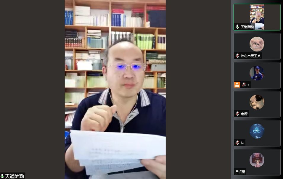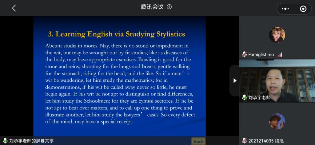 2022年5月26日下午15:00,天渠书院名誉院长刘承宇教授通过腾讯会议“云上课”的方式,以“赏文体,学英语”为主题,带领大家赏析各类文学作品。通过探讨其语言风格、文体特点及规律,促进同学们对语言深层次的思考与分析。