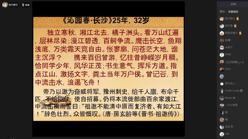 诗有史,词亦有史。为引导同学们进一步了解毛泽东诗词中的红色精神,5月20日下午4点,北山书院名誉院长王于飞教授以线上授课的形式,对主题为“党史中的诗词”精品课进行讲解,此次授课参与学生共计200人。