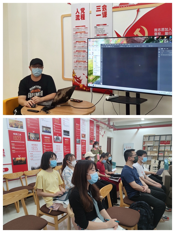 实践操作,巩固培训成果 纸上得来终觉浅,绝知此事要躬行为。为了让大家更加深刻了解设计步骤,钟学长还通过日常海报平面设计案例入手,通过字体样式的调试、图片背景的搭配、海报主题的突出等几个方面的讲解,让现场的同学以小组为单位现场上手实操设计一张海报,以此强化技能知识的记忆。在设计过程中,钟学长也是耐心指导和讲解,通过自己设计海报,初步构建了基础的PS知识体系。
