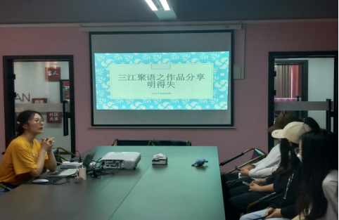 诗歌是文学圣坛上的一颗明珠,它没有歌曲般动听,但它有韵味、有传神,它就像一杯茶,需要细细品味才能拥有精髓。3月12日,三江文学社以诗歌创作分享为题于爱莲书院多功能影音室开展“三江聚语之作品分享明得失”活动,各方笔友齐聚一堂,大家相互交流、学习,激发各自的创作灵感,总结创作中存在的问题。本次活动由文学社社长,杜苑瑾学姐担任主讲人,在她对分享的诗歌进行细致解读的同时,也针对大家在学习与创作方面时常会出现的问题,结合自身经历,为大家作出深入的分析与合理的建议。