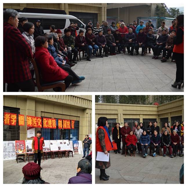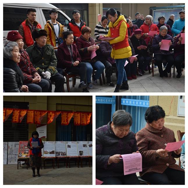 志愿者们与社区居民们互动唱《学习雷锋好榜样》,诵读雷锋名言,观看学习雷锋的图片和科普展览,志愿者还发送了“学雷锋、树新风”文化志愿者服务活动宣传资料,并仔细讲解,弘扬雷锋精神。