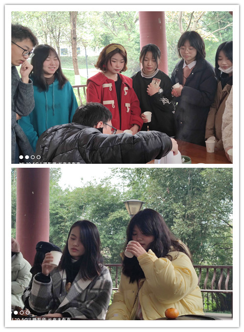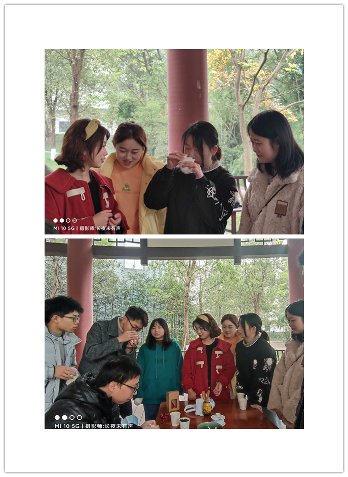 最后,陈老师进行乌龙茶的冲泡,并对乌龙茶的冲泡技巧进行了简单地说明:水一定要是沸水,然后水壶沿盖碗内壁转动一圈,最后定点高冲。之后,同学们用纸杯端着从公道杯中分离出来的茶汤,听着簌簌的落叶声,闻着让人心旷神怡的香气,在北山斋这片小天地中,静静地品啜着茶汤,感受着天地之静美……
