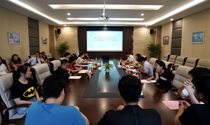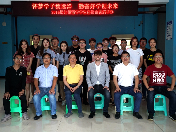 放飞梦想,展翅翱翔,你们的未来就在前方,中德应用技术学院于6月21日下午15:00整在中德会议室召开了2016级赴德留学学生座谈会。参加本次座谈会的嘉宾有重庆邮电大学移通学院校长张德民教授、校长助理,中德应用技术学院院长尹浩亮、国际处韦橙橙老师、外教李成老师、德语教师代表吕巍老师、中德学院全体辅导员老师及2016级赴德留学学生代表共计25人,会议由副院长武强义老师主持。