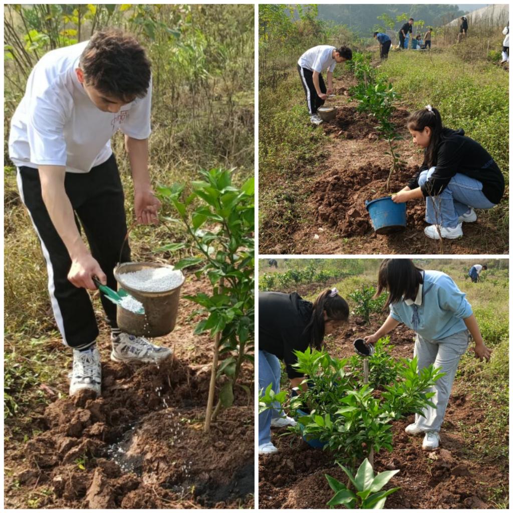 参观完培栽基地,刘老师亲自带领同学们“下田实操”,从柑橘树的养分需求、施肥方法、土壤条件等方面进行现场操作,栽种的同时也为同学们科普到:“我们现在施入土壤的钙钾镁磷类有机肥、复合肥都是果树叶片光合作用的重要原料。施肥的时间宜早不宜晚。在即将入冬时施肥,新梢基本停止生长,树体消耗养分少,能够增加树体养分储备。另外,这时的地温尚高,断根容易愈合并可发出新根,有利于钙镁等微量元素的吸收,更利于果树的生长。”这些宝贵的经验源自于漫长的传统农业经济社会,我们的祖先用他们的勤劳和智慧,创造了灿烂的农耕文化,而今也仍然渗透在我们生活的方方面面,了解农耕文明,传承耕读文化,给生活以启迪。