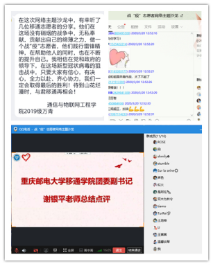 活动最后学校团委副书记谢银平老师也向大家进行了分享,她说她为移通学院有这样优秀的同学而感到骄傲。她指出我们的志愿者能在一线战“疫”,是同学们无悔的选择,更是青年学子敢于担当的体现,我们更多的同学虽不能上前线,但是我们可以从自身出发做一名“守护者”,守护家人与自己的健康,同时我们还可以当一名“修行者”,修身养性、提升自己的能力,积蓄前行的力量,同时我们还应该成为“识途者”,无论我们身在何方,我们都应该为自己的身份感到骄傲,为自己的祖国代言,青年兴则国家兴,青年强则国家强。相信只要青年学子奋发图强,我们的祖国必将越发的强大。