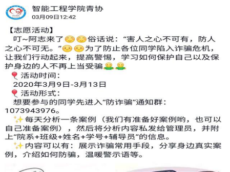 在这个网络飞速发展的时代,通过网络、电信、贷款、短信等手段对同学们进行诈骗的违法事件层出不穷。当今正直疫情的特殊时期,大家的生活学习更是依赖于网络,为增强同学们的安全防护意识,避免上当受骗,3月9日-3月22日,智能工程学院青年志愿者协会于线上开展了“志愿发声,防骗宣传”活动。本次活动旨在通过向同学们分析诈骗手段和案例,达到识破骗子面目、增强防范意识的目的。为了形成长期有效的防护机制,智能工程学院学院青年志愿者协会还建立了防诈骗的通知群,通过每天分析一道案例的方法,以真实案例让同学们提高警惕,此外,同学们也可主动分享了解到的诈骗常用手段,向大家分享身边真实案例。活动中,同学们纷纷表示对不法分子的骗术和套路有了更深入的了解:诈骗有区别于其他犯罪形式,在整个案件实施过程中,会维持一种相对“平和”的方式,使人们内心的防线逐渐瓦解,从而轻易上当受骗,所以,志愿者呼吁同学们一定要树立独立思考的能力,面对陌生人,无论是网络渠道还是现实生活,都应该保留一份警惕之心,积累生活智慧,慧眼识片。