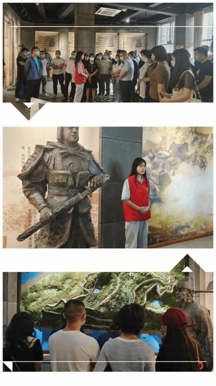 在学生讲解员杨正芳的引领下,来访人员步入钓鱼城历史文化博物馆一楼展厅,首先她向大家介绍了钓鱼城历史文化博物馆的建立以及所建目的;其次介绍了钓鱼城历史文化博物馆的馆内主题——《鱼城雄魂》,由展厅宋蒙两军惨烈交战的背景图引出了钓鱼城军民守城抗战36年的罕见奇迹;接着,参馆人员跟随讲解员的步伐移步到钓鱼城遗址沙盘模型前,在讲解员生动形象的描述下直观地展示了钓鱼城独特的山城防御体系,部分人员俯身上前观看,讨论着军事防御和民用保障两大体系;最后,余玠、张珏、王立等将领的形象及身份被大家知悉。来馆人员以热烈的掌声对学生讲解员杨正芳的精彩讲解表示感谢。
