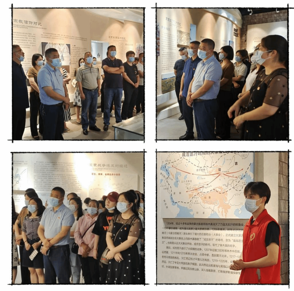 学生讲解员严俊辉带领大家步入二楼展厅,分别从大事记板块、时代风云板块、战争烽烟板块等板块向大家讲解。首先讲解员严俊辉以清晰的时间线条向大家陈述了钓鱼城守城36年的抗战历史。随后在时代风云板块,讲解员严俊辉从墙壁上的大蒙古国的领域图分析,阐述了成吉思汗进行大规模战争的状态,以生动形象的语言讲解了宋蒙战争爆发的经过,参馆人员一边听讲解员声情并茂地讲解,一边拿出手机拍照记录。战争烽烟板块,讲解员以边问边答的方式介绍了因为社会经济地位和军事战略地位两大地位使得四川最早弥漫在战争硝烟的主战场,以及余玠在两年中初步建立了“以山为点,以江为线,点线结合,网状分布”的山城防御体系。大家一边听着讲解员讲解,一边讨论着钓鱼城之战的相关事件。