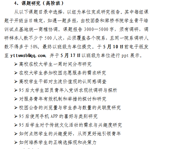 高阶班学员主要是校、院两级学生书记处及主席团,为使高阶班能够向移通、向完满教育展示更好的班级研究成果,本学年“青马工程”完骨班相关负责老师和实践基地相关老师为学员们量身定制、挑选了十余个课题题目,课题大致分为完满教育方向、大学生骨干领袖、青年成长、思政方向;根据课题特点,学校将聘请校内名师、完满教育相关职能部门负责人、名企讲师等来对高阶班的学员们进行定向授课,以课题研究与MBA案例制作的方式,培养高阶班学员们的综合能力,同时强调学员加强自身学习,注重团队成员自身学习和团队建设工作,在平时学生干部工作中深入研究完满教育理论和实践,通过项目、课题等方式从学生角度进行凝练;从学生角度并将理论研究与实践指导相结合;从学生角度将研究成果与完满教育科学发展相结合,力争使高阶班学员们在毕业时交上一份属于自己的完满教育答卷。