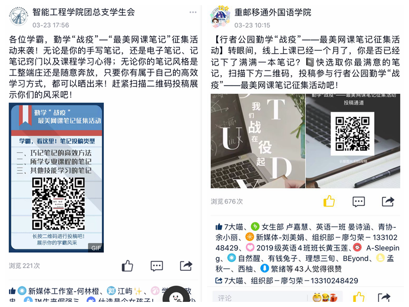 春寒虽料峭,花开正当时。为努力建设书院优良学风,让同学们养成良好的“宅”家学习习惯,有计划的开展各类课程的预习和复习工作。3月24日,荷悦书院群携手天渠书院群开展了行者公园勤学“战疫”•最美网课笔记征集活动。