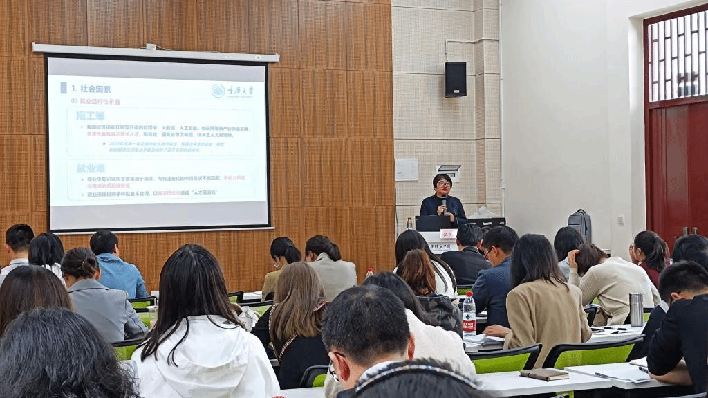 4月26日上午9:45,张珂老师主讲的毕业班就业工作开展心得与做法在天渠书院报告厅拉开帷幕,当今“慢就业”现象愈发凸显,小圈子文化盛行,当代大学生就业创业观念受到一定影响,针对目前大学生就业现状,张珂老师提到辅导员要理性看待并积极开展家校联系工作,加强和学生交流沟通、发掘学生身上的闪光点,做好学生职业生涯规划的引路者。最后他建议辅导员结合时事深入了解相关就业创业政策,在对接学生就业创业板块工作时有更科学合理的参考。