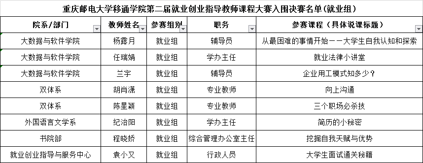 此次复赛参赛选手在课程选题、教学内容、教学设计、教案制作、教学技巧与方法、教学手段、语言表达、PPT制作等内容上进行了精心准备。我校也通过此次大赛,进一步营造了就业与创业指导课程建设的浓郁氛围,深化了毕业生就业工作的内涵建设,促进了就业与创业指导课教师教学经验的交流和教学水平的提高,加强了就业创业教育和就业创业服务,提高教师的教育教学水平和就业创业指导能力。提升了就业与创业指导师资队伍的职业化和专业化水平。