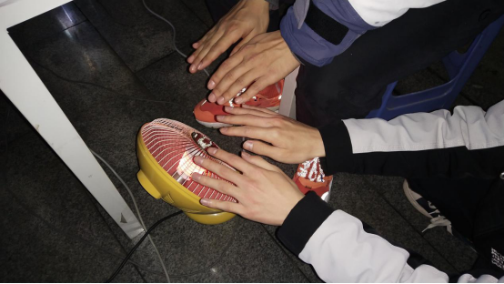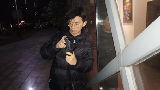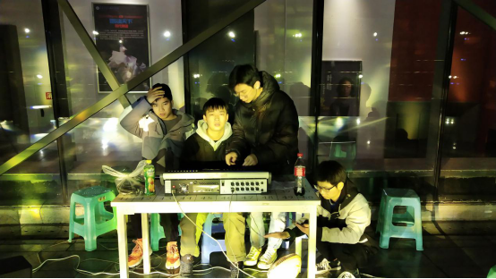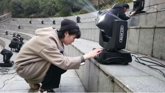 不下雨的时候,他们把17盏光束灯从和缤果大剧院搬出来,为了不影响附近的居民,他们只能工作到晚上10点,手冻僵了,就轮流换成员继续技术编排,再围着“小太阳”大家一起取取暖。当夜雾降临,路上人烟稀少的时候,他们又小心翼翼的把每一盏灯搬回缤果大剧院,如此重复,却没有一丝怨言,尽管身体很冷,灯光对眼睛的刺激,编排工作的疲惫,但是有指导老师和一群小伙伴的陪伴,大家也是有说有笑,其乐无穷。