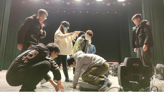 第二步:搬放光束灯、位置调整、信号线、电源线连接,一切工作有条不紊的进行。在老成员的带领下新一任剧管小伙伴逐步成长,取得阶段性进步,这才得以让我们的灯光秀有现在的成效。