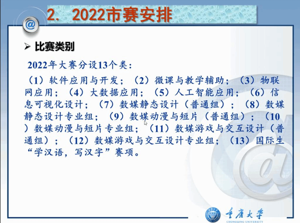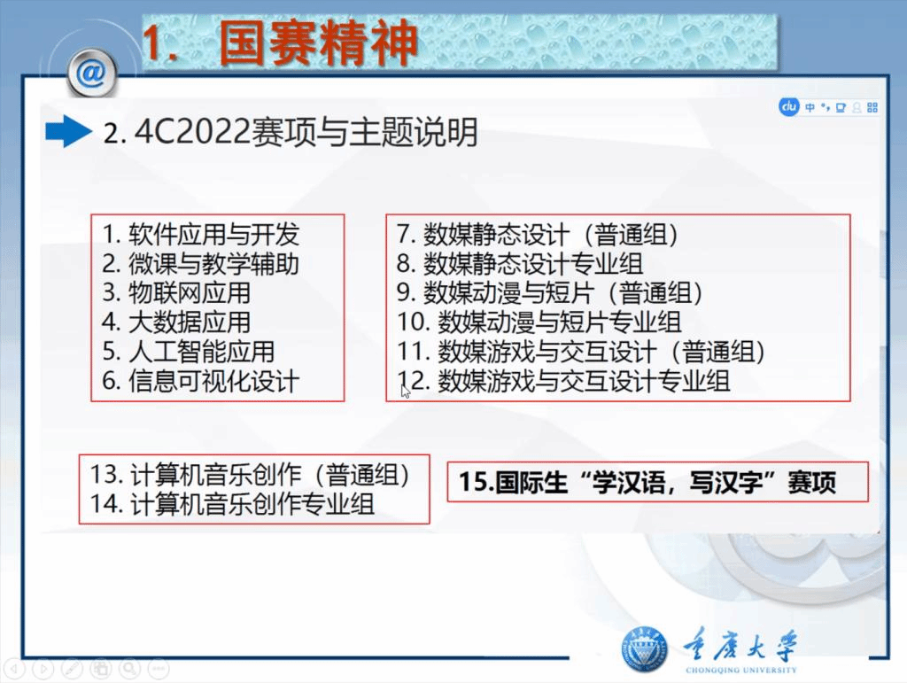 会议上,首先由重庆市级赛负责老师刘慧君副教授传达了2022年市赛总体安排,讲解了大赛的赛项和主题,并对市赛、国赛的比赛时间、比赛要求进行了详细的解读。然后由大赛委员会曾一教授对2021年重庆市参加国赛的情况、安排等进行了通报。