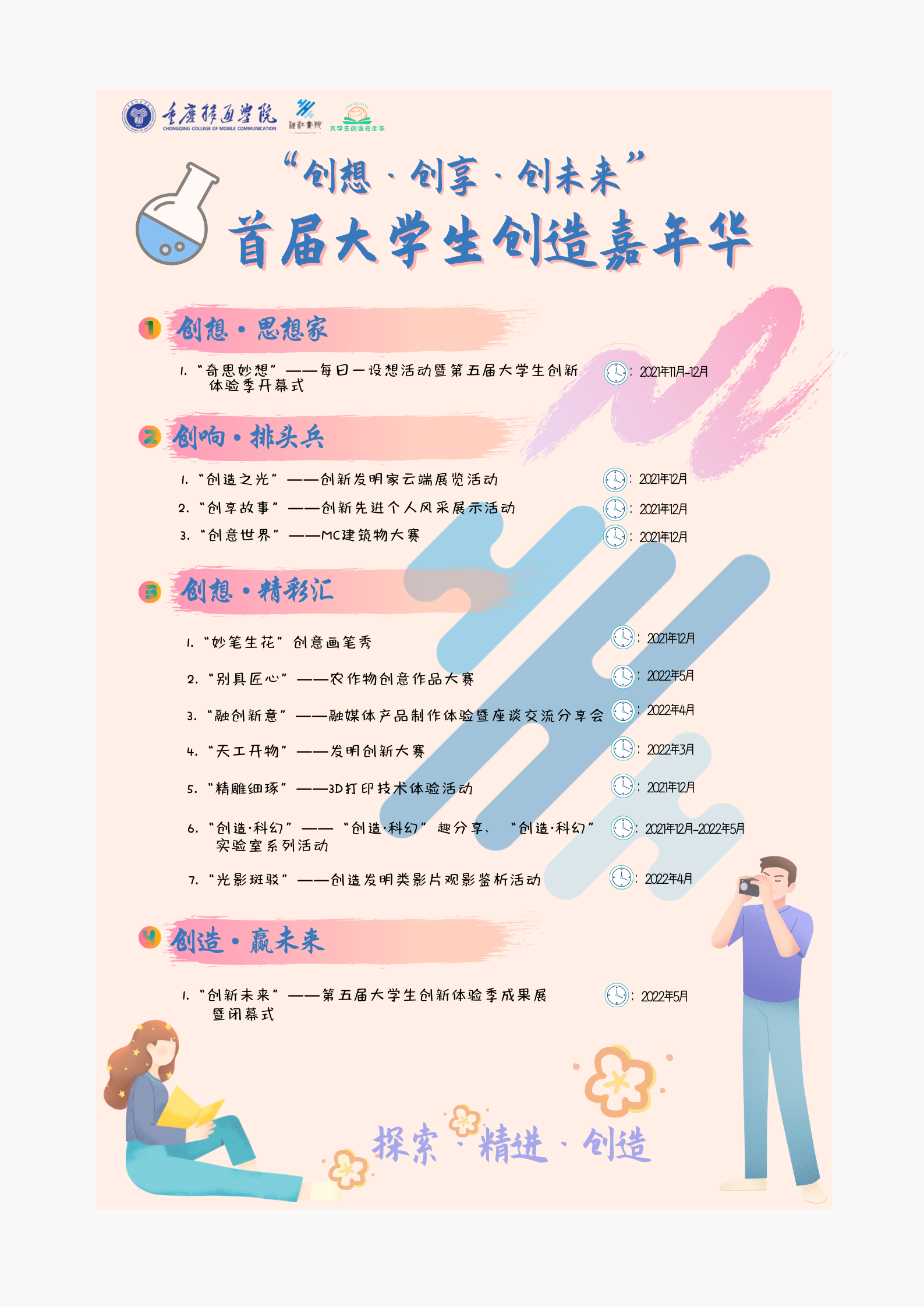 “乐教、乐学、创造、创业”,作为学校完满教育培养学生创新创意创造的培育承载平台,汇江书院结合“完满教育”育人理念,以“创造力”为核心基点,依托“三创三带”联动发展特色,发挥“创造力”培育的资源集聚优势,在去年12月1日推出“创想·创享·创未来”首届大学生创造嘉年华,活动以创新创造为引领,以“创想·创享·创未来”为主题,以“奇思妙想”每日一设想活动为开篇,囊括“创想·思想家”、“创响·排头兵”、“创享·精彩汇”、“创造·赢未来”四个篇章十余个子活动。汇江书院希望通过设计、举办该活动,引导书院学子在过程中激发灵感,启迪创新创造精神,提高创造能力,促进对生活、学习和工作方方面面的创新与应用,帮助大家施展才华、提升才干、磨练意志,享受创造的过程和乐趣,用聪明才智和勤劳双手创造出精彩的未来。