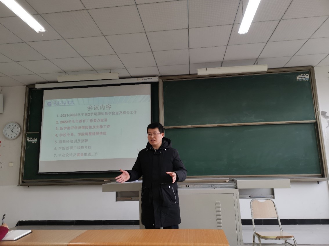 为了迎接2021-2022学年第二学期期初教学检查,推进学院各项工作顺利开展。大数据与软件学院于2月23日下午4点,在第四教学楼402教室,召开了期初教学检查及相关工作部署会议。会议由大数据与软件学院院长闫会峰主持,学院全体教工及辅导员参会。