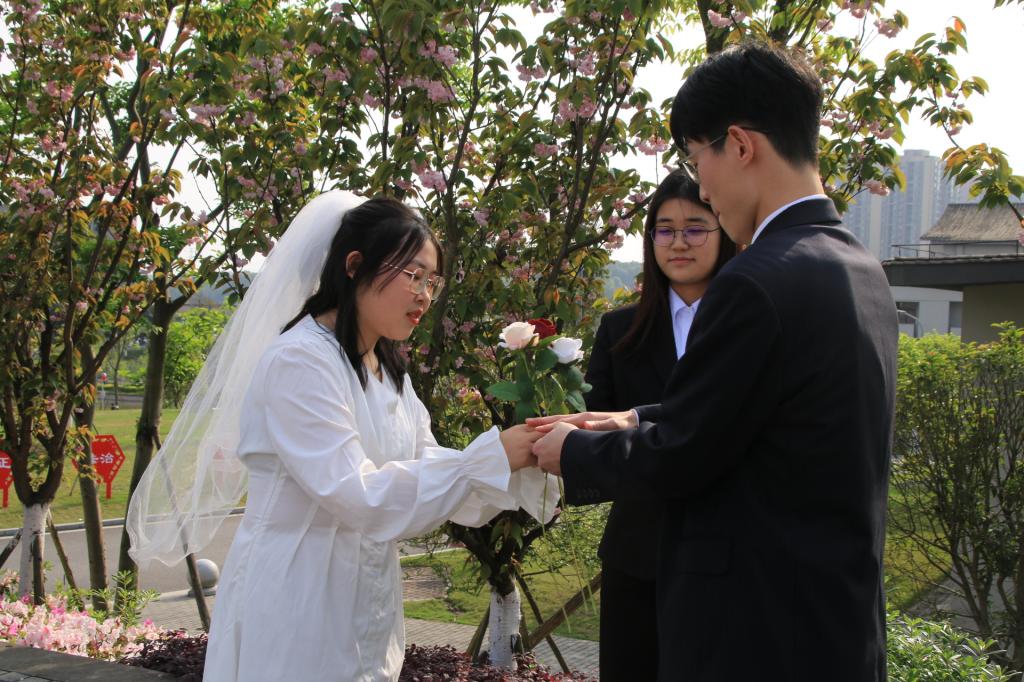 “You are my sunshine my only sunshine,you make me happy when skies are grey,you'll never know dear how much I love you,so please don’t take my sunshine away...”,由大学生国际交流协会陈沿庆与颜纪伟两位同学带来的主题英语情景剧“Marriage”,更是将“爱情”通过语言交流的方式进行了生动的演绎。春光旖旎,微风和煦,流利的英文对话,庄严的婚礼誓词,自然的神情动作,令在场的师生陶醉其中,原来读书还可以如此浪漫,大家都纷纷举起手机记录下这美好的仪式时刻。