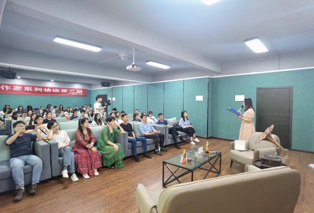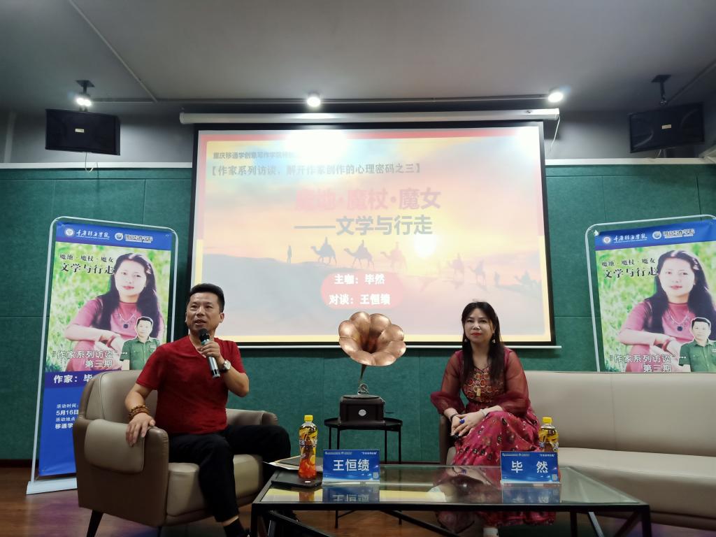看到“魔地·魔杖·魔女”的标题,不禁升起一种异域的联想。很想知道在一场作家访谈中这三个“魔”字是怎么诠释?当走进5月16日中午爱莲书院影音室,发现这场活动似乎与以往有些不一样。即将开启的是创意写作学院作家系列访谈“解开作家创作的心理密码之三”的第三场作家访谈活动,主咖是带些异域风情的作家毕然,采访者是作家王恒绩。