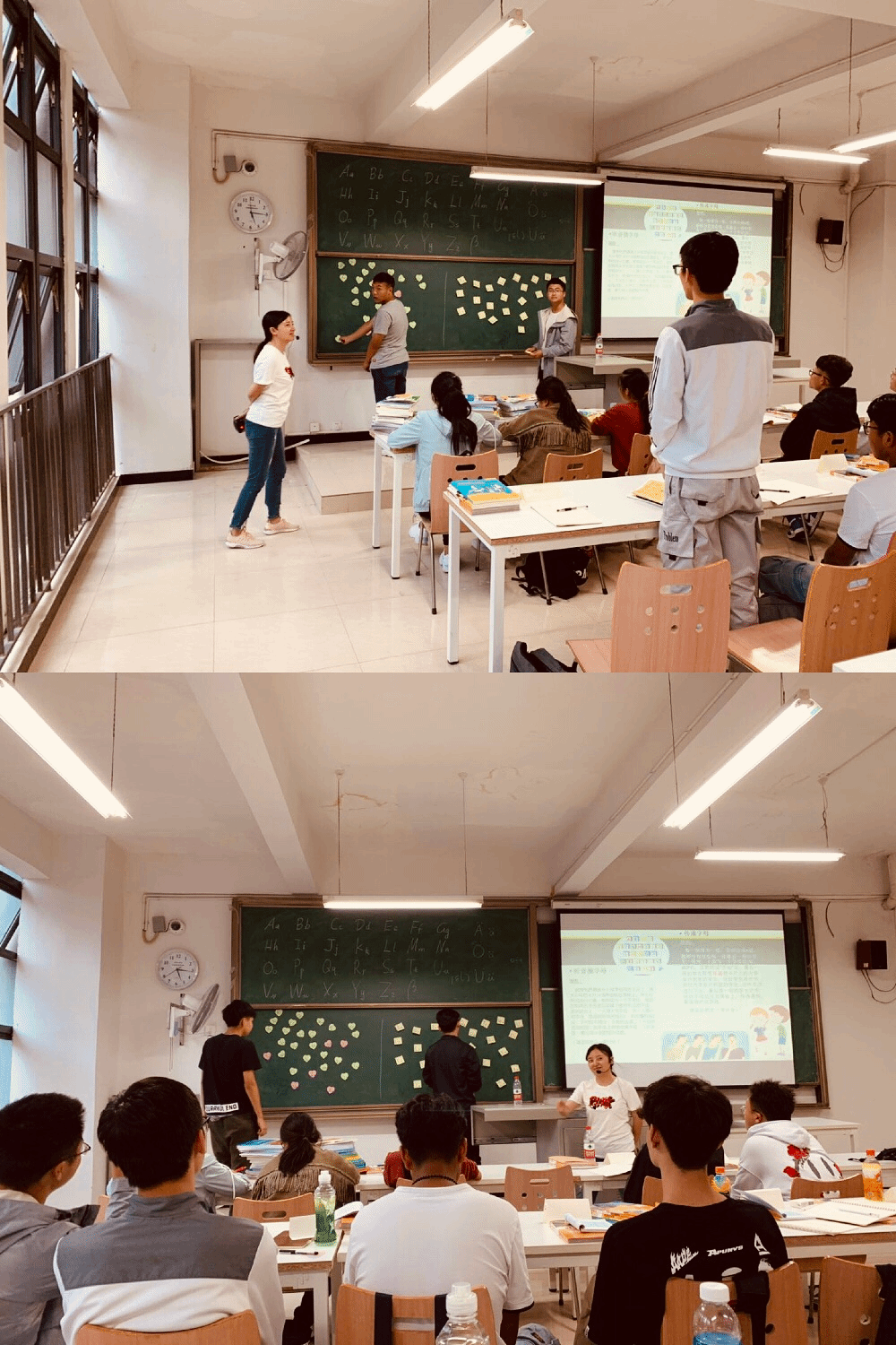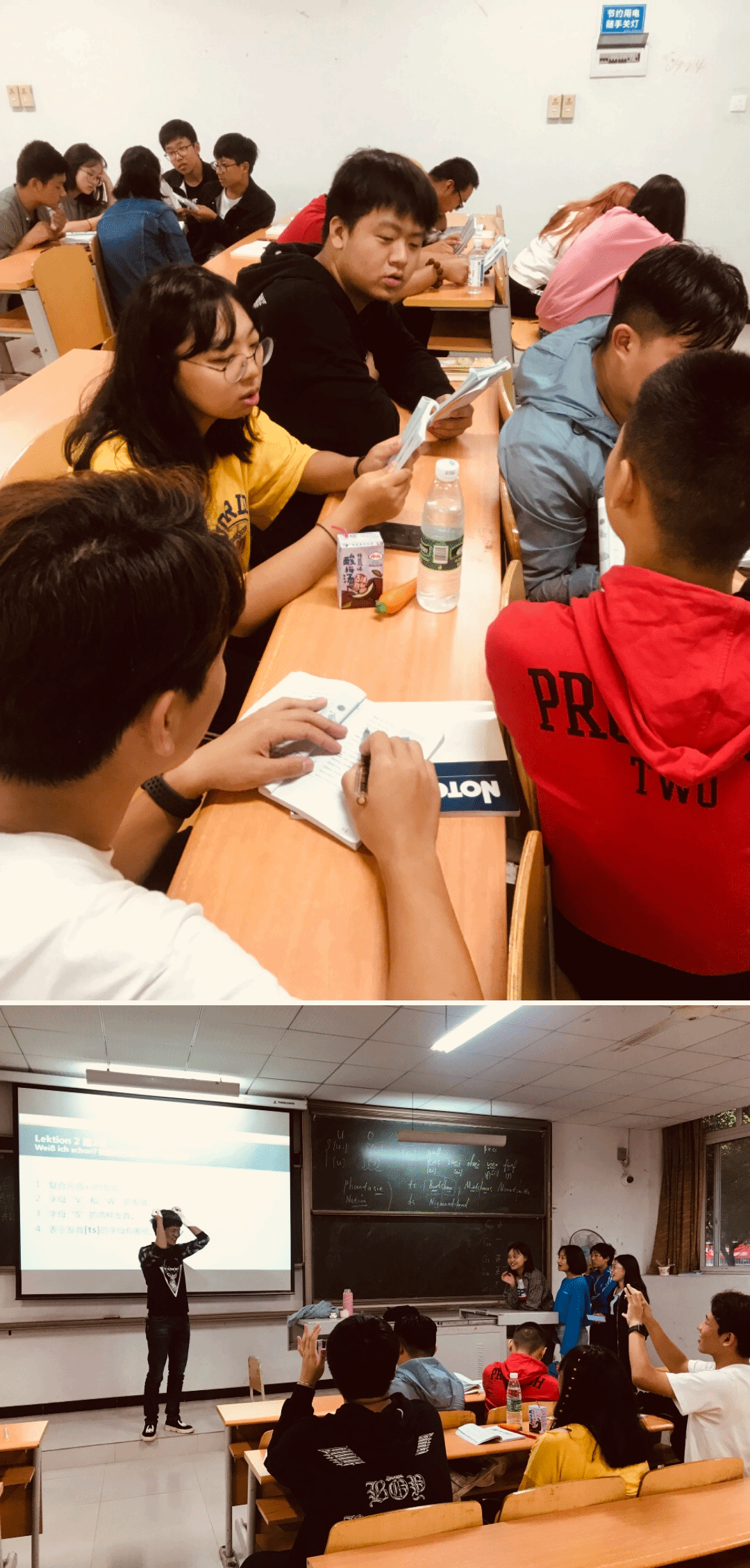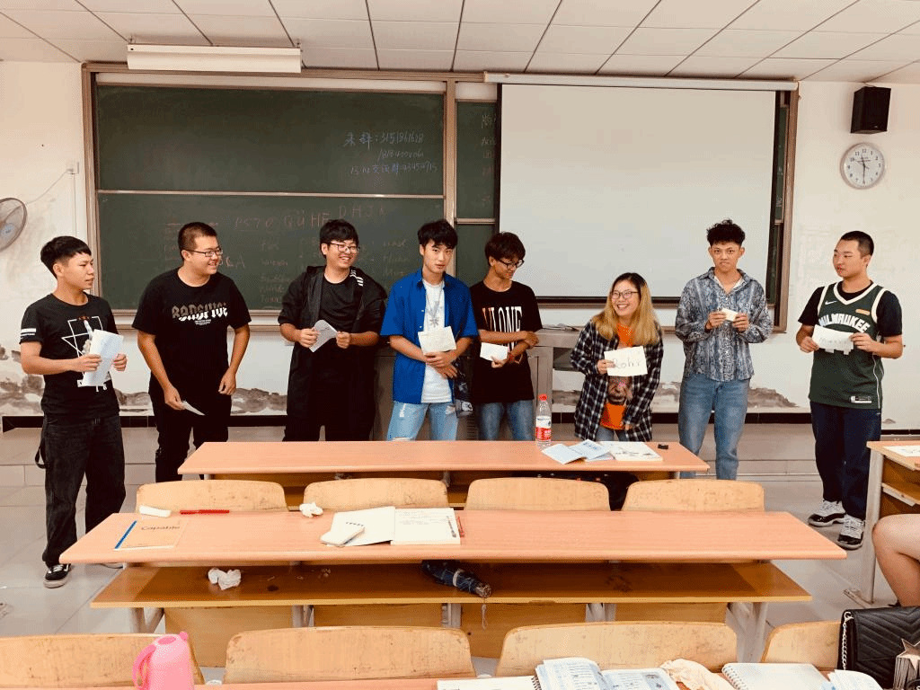 在2019级工商企业管理国际1班,刘聪老师为学生们准备了单词特训营:学生们先报数1-5,报相同数字的同学为一个小组,分为5组,这样同学们就会和还不太熟悉的同学分成一组。教师先讲解字母以及字母组合的发音,然后各个小组自行拼读对应的单词,期间可以向教师请求帮助,在规定的时间内完成组员间的配合。之后经过抽签的形式每个小组会分到不同的音素,组员依次朗读,最后加起来错误数最多的小组则必须要进行才艺展示。