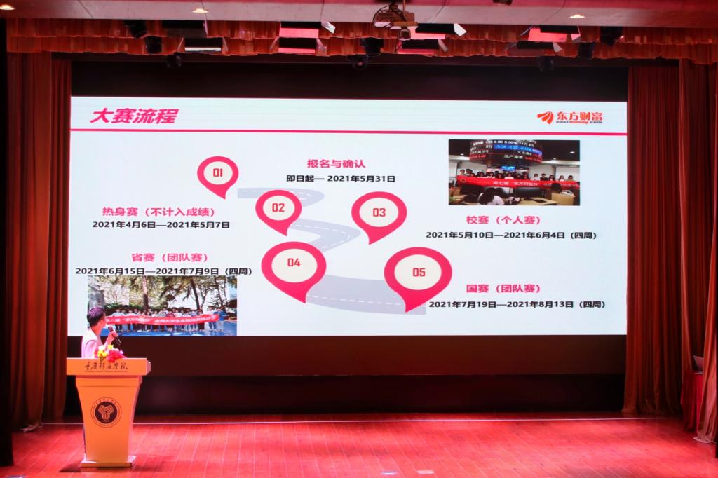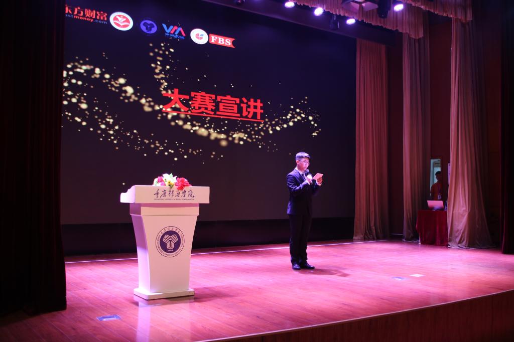 “全国性、趣味性、大众化”是东方财富证券重庆新南路营业部总经理唐涛对大赛如今发展成果的概述。接着唐涛先生通过赛事规则、比赛奖励两个方面动员同学参与大赛,激发学生投身金融实践的激情。如今金融精英挑战赛已成星火燎原之势,展现出青年学子拼搏向上的无穷力量。