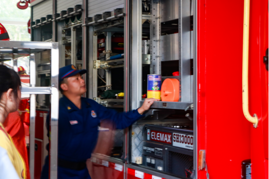 体验活动正式开始,消防队员们向同学们详细讲解了消防车辆的名称、容量及所配备的各种装备器材的用途,对于同学们提出的问题,消防队员耐心的进行了解答。