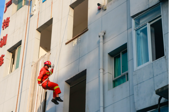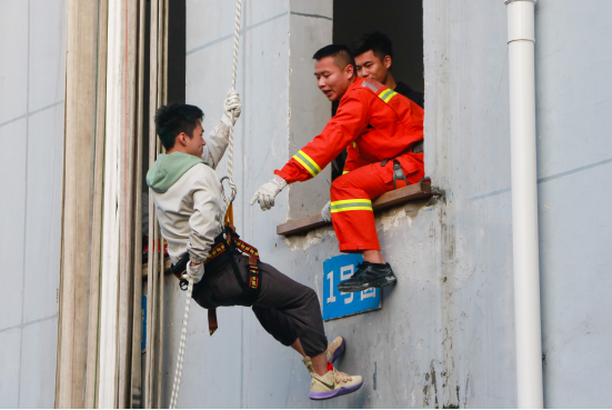 随后,消防队员现场演示了消防工具的操作、如何穿戴防护服、绳索逃生等项目。在消防队员讲解完后,同学们跃跃欲试、积极参与。部分同学克服自身恐惧,挑战了高空绳索项目,对消防安全有了更加深刻的认识。