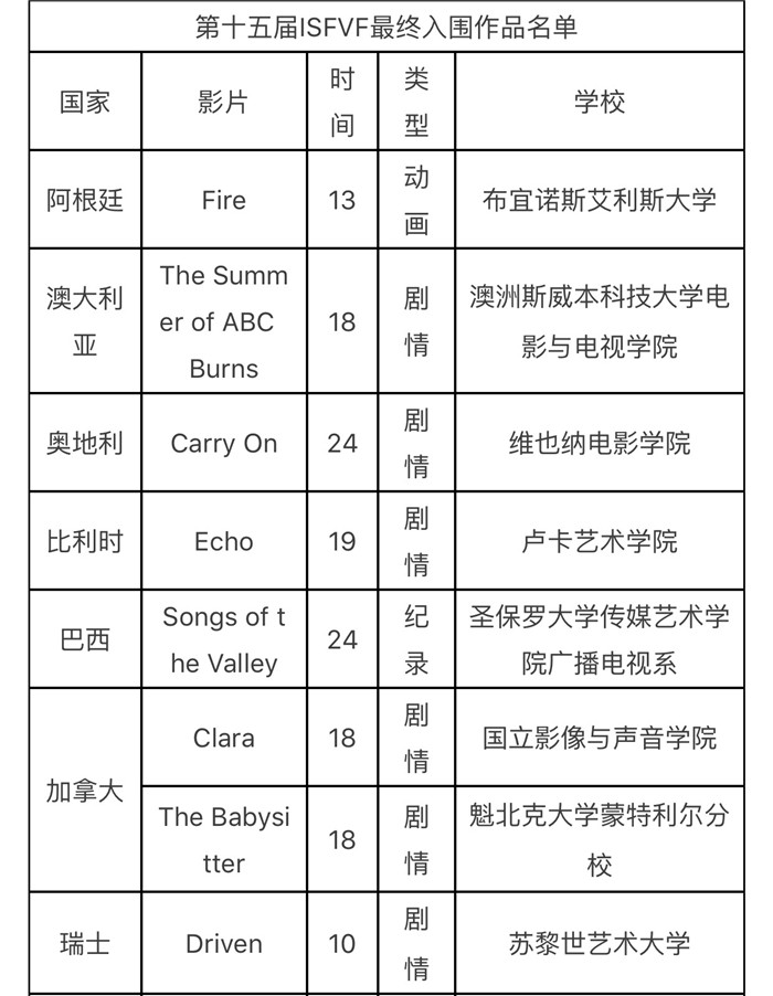 自2002年起,北京电影学院已成功举办15届ISFVF,成为颇具国际影响力的学生影视作品展。今年影展共收到来自53个国家和地区的报名影片1161部,刷新了历届招展数量的纪录,最终有31个国家和地区的76部影片入围,包括53部剧情片、11部动画片、7部纪录片以及5部其他类型影片。