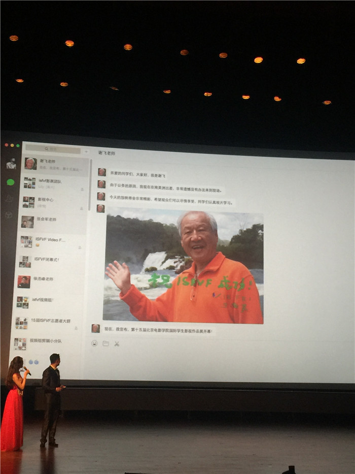 10月16日晚,彭可与陈丁老师参加了隆重的开幕式。ISFVF名誉主席、中国第四代著名导演谢飞老师由于工作安排未能亲到现场,他通过微信从海外发来祝辞,别具一格的方式引起全场掌声。开幕式当晚还放映了国际组第一组的入围影片,高质量、高水准、多元化的各国学生作品让二位老师感到相当震撼。