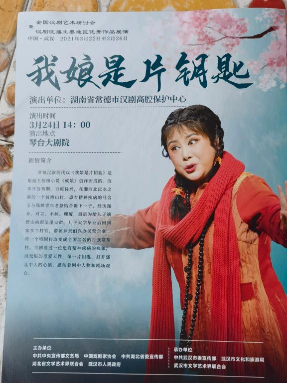 3月24日下午两点,在高山流水遇知音的发源地,中国最顶级的大剧院之一、湖北武汉琴台大剧院,根据我校创意写作学院作家教师王恒绩小说《疯娘》改编的汉剧《我娘是片钥匙》,参加由中宣部主办的全国汉剧流播展演大赛,楼上楼下三层1802个座位满满当当,反响极其强烈,掌声多达12次,很多观众是红着眼睛走出剧场的。今晚,大赛剧组移师于湖北省委专属的洪山礼堂再演第二场,省委领导将现场观看。
