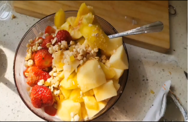 在众多的劳动成果展示中,一位同学为父母做的下午茶最是引人瞩目,她贴心地上传了制作视频供大家学习,让大家都可以在这炎炎夏日中为自己的家人带去丝丝清凉。她先是准备好了下午茶所需的材料:适量的草莓,一个苹果,两个油桃,以及下午茶的灵魂——酸奶。在给水果洗净,削去果皮之后,便开始摆盘,这可是慢工出细活的事情,在她的精心布置下,一份诱人的下午茶便制作完成了。正如她自己说的那样:虽然只能在家上网课,但也不要“亏待”自己,“亏待”家人。所以就利用一个没有课的下午,用家中冰箱里的酸奶水果,做一个应景的水果捞。