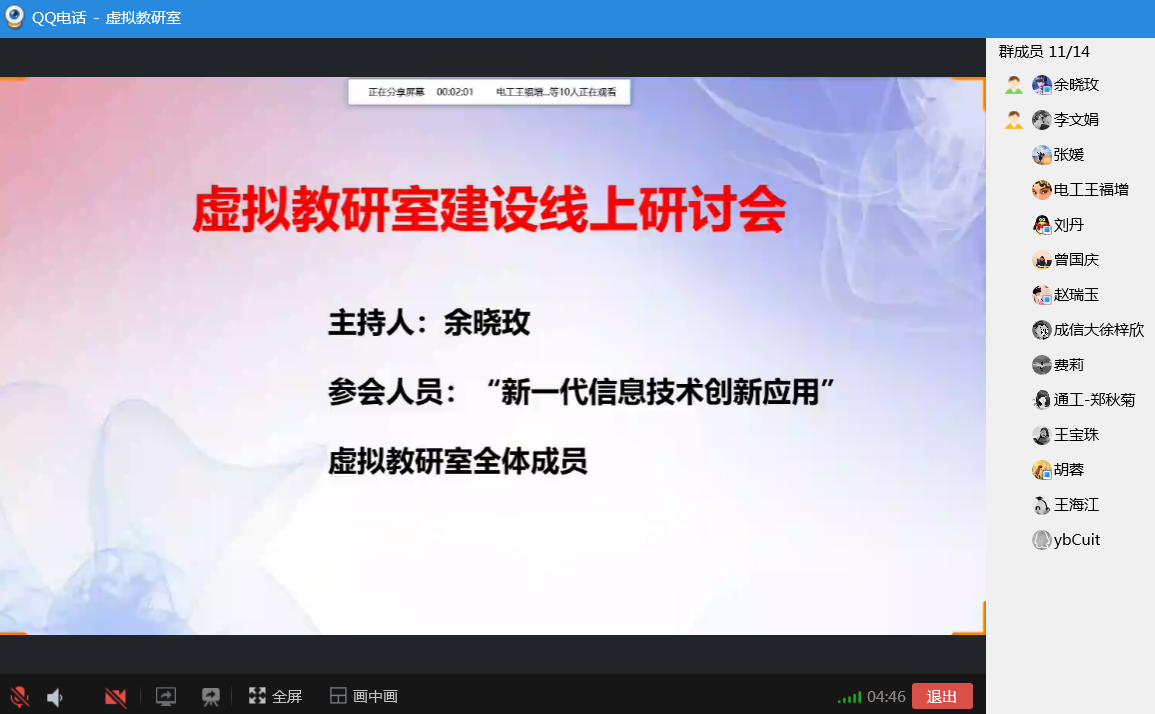 本次教研活动主要围绕一流课程建设、课堂教学手段创新、学科竞赛三个方面进行沟通交流。会议伊始,通信与信息工程学院院长李文娟教授对成都信息工程学院的大力支持及各位老师为虚拟教研室建设的辛苦付出表示感谢。同时也对教研室工作的开展提出了愿景,希望后期两校共同搭建协同创新的交流平台,共建课程、共享课程资源,以在线课程为载体,创新实践为基础,通过跨区域协作整合校内外资源、创新研究方式、利用互联网+智慧教育的先进手段,探索教学改革新思路、新方法。希望通过虚拟教研室的建设,两校能够共同打造出一支高水平的教学团队,培育优质教学研究与实践成果。