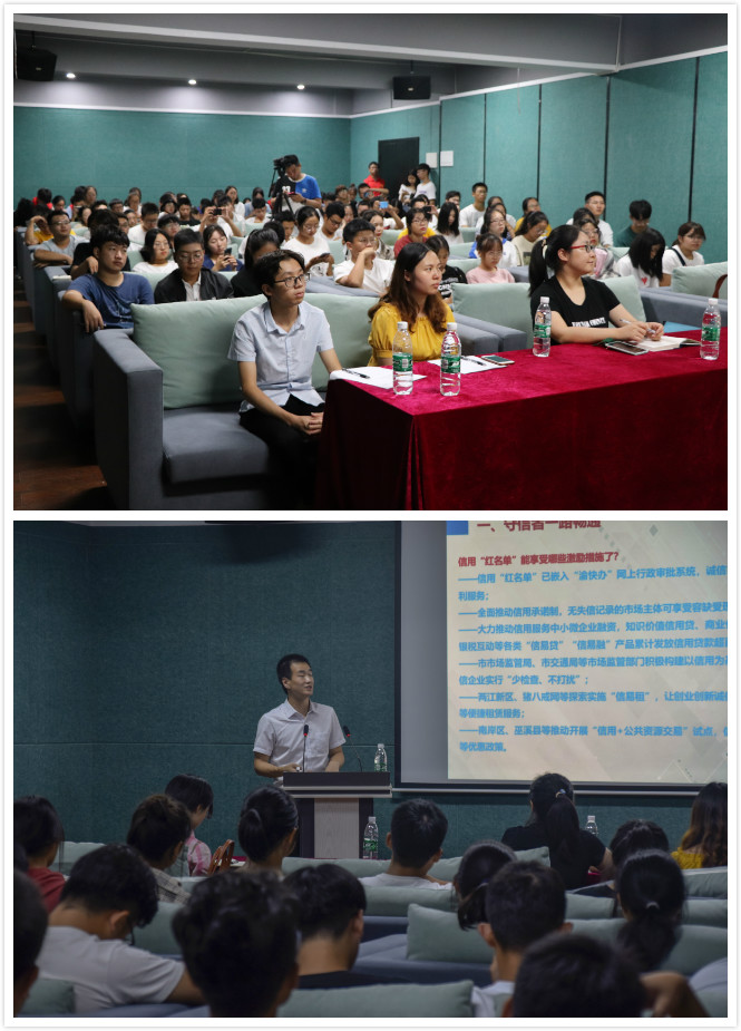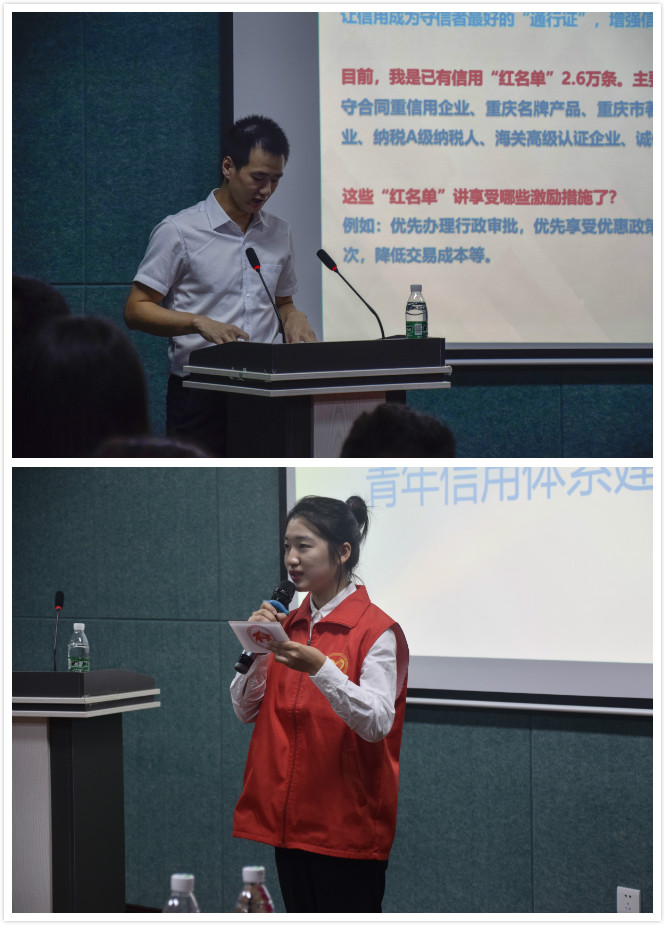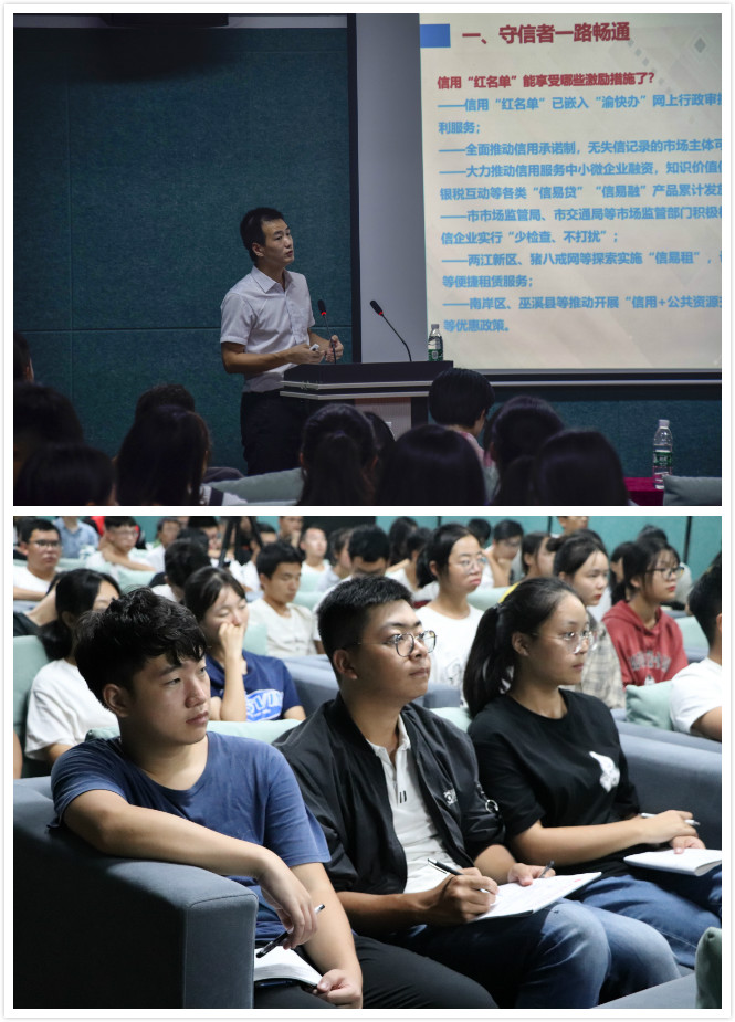 本次讲座邀请到重庆市发改委财经处主任科员张伟老师担任主讲人。讲座上,张伟老师提到,社会信用体系建设核心在人,源头在于青年。青年一代讲诚信、守信用,整个社会的诚信建设就有希望。在青年一代中培养讲诚信、重信用的精神理念,就是在为诚信社会建设培植土壤,为信用中国建设激活动力。青年通过对信用体系的认知及贡献,成为社会信用体系建设最好的实践者、传播者和继承者。