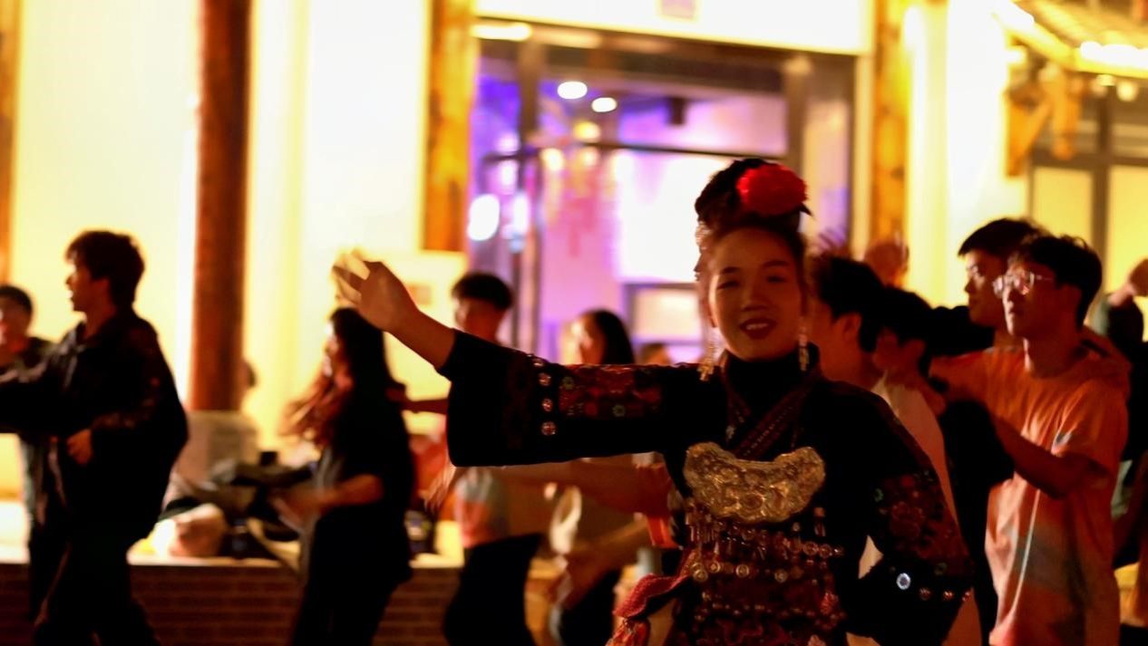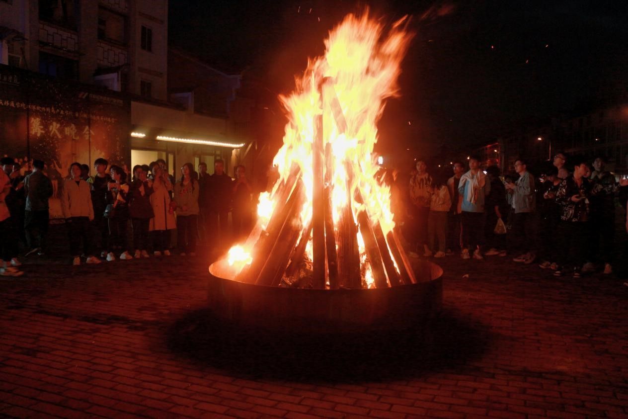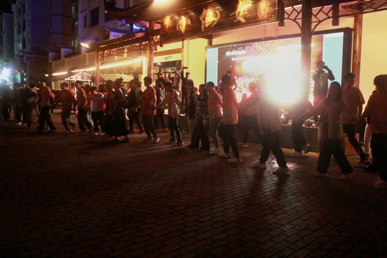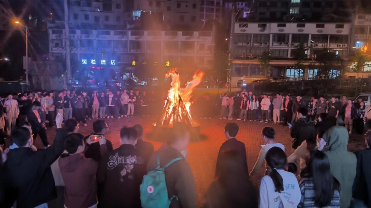 一首“最炫民族风”,点燃了现场,拉近了彼此;一段舞蹈,一首独奏,还有苗家独有的竹竿舞,更是让同学们体会到了苗族的独特人文风情,热情洋溢之声,自眼前蔓延。火热的不仅是篝火,更有享受这个夜晚的众人,周边的游客与居民也抵挡不住这浓烈氛围,加入队伍且歌且舞。