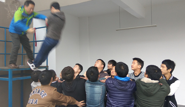 信任背摔:一项集个人挑战与团队协作的经典素质拓展项目。挑战者在确定的安全保护措施下,站在1.2米高处背对团队成员向后倒下,由团队成员协力接住挑战者。项目侧重考验挑战者克服恐惧心理的能力。正如教练所言:项目的经典在于,每一句承诺体现了一种责任、是勇气、是力量和信心!当奋力吼出那一声“准备好了!”责任与信任,真正的淬炼着每一位挑战者的勇气!