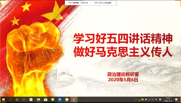 党的十八大以来,习近平总书记每年总会在“五四”前后勉励青年人不断奋进。当前正值举国战“疫”之时,总书记给予中国青年一代的无限鼓励显得更加的意义深远。而5月5日是无产阶级的伟大导师马克思的诞辰纪念日。为深入学习总书记五四讲话精神,同时缅怀马克思,做好马克思主义传人,5月6日16时,政治理论教研室全体教师齐聚云端就总书记重要讲话、总书记谈马克思等相关内容进行了在线研读与交流,本次会议由政治理论教研室主任李阳老师主持。