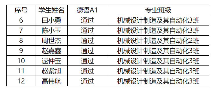 2022年1月19日,歌德语言中心发布1月11日德语A1考试成绩。中德应用技术学院2021级机械设计制造及其自动化(中外合作办学)专业12名学生全部通过考试,通过率达100%,此次考试最高分95,创历史新高。热烈祝贺以下同学通过德语A1考试,特此喜报!