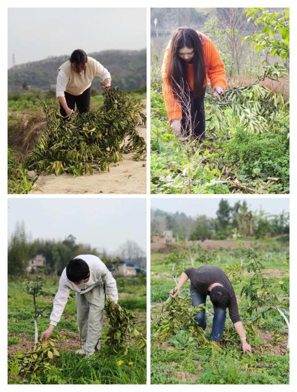 3月17日下午14:00,别都书院耕读基地实践第12期活动如期举行,参与同学怀着期待且激动的心情乘车前往合川区南津街九峰山劳动实践基地开展劳动实践活动。活动过程中,同学们深入了解了蜂糖李的栽培技术和培育过程,并在基地负责人刘芸老师的带领下对蜂糖李果树进行养护,分别通过去除侧芽和捆绑树干的方式保障果树顶端优势,提升结果率。在刘老师的专业指导下,同学们掌握了养护经验,全身心投入到与了养护过程中。来自2020级别都书院、淬炼国际商学院的李雪鼎同学由衷的感慨到:“亲身体验农业劳动,学习农业文化知识,才能切身的感受到劳动的魅力,假如你不注重实践,满腹经纶也是枉然。”